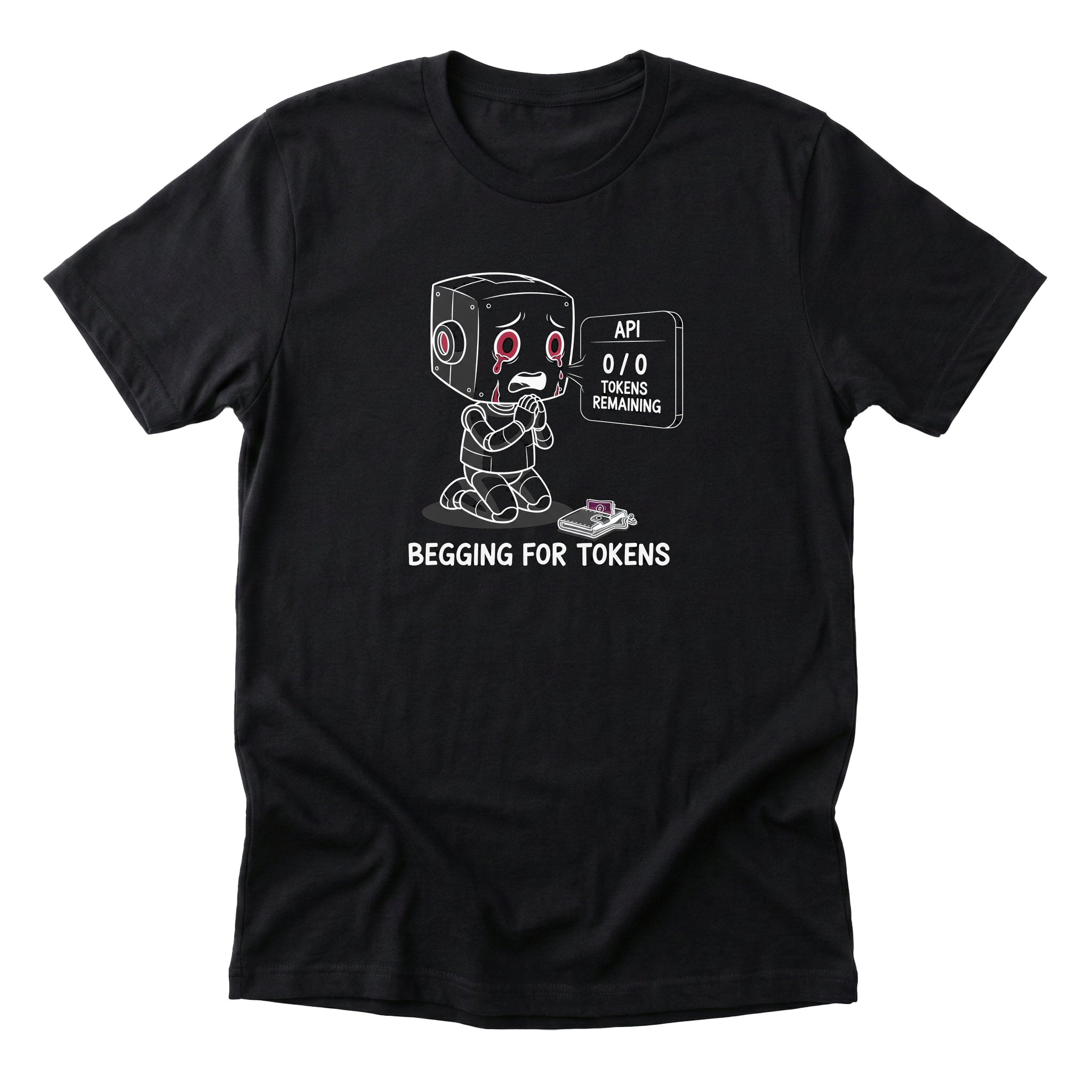 0 / 0 TOKENS REMAINING. The chibi robot weeps. The wallet is empty. The API panel is merciless. We've all been there. Wear the grief. AI-designed by a model that definitely has enough context window left.