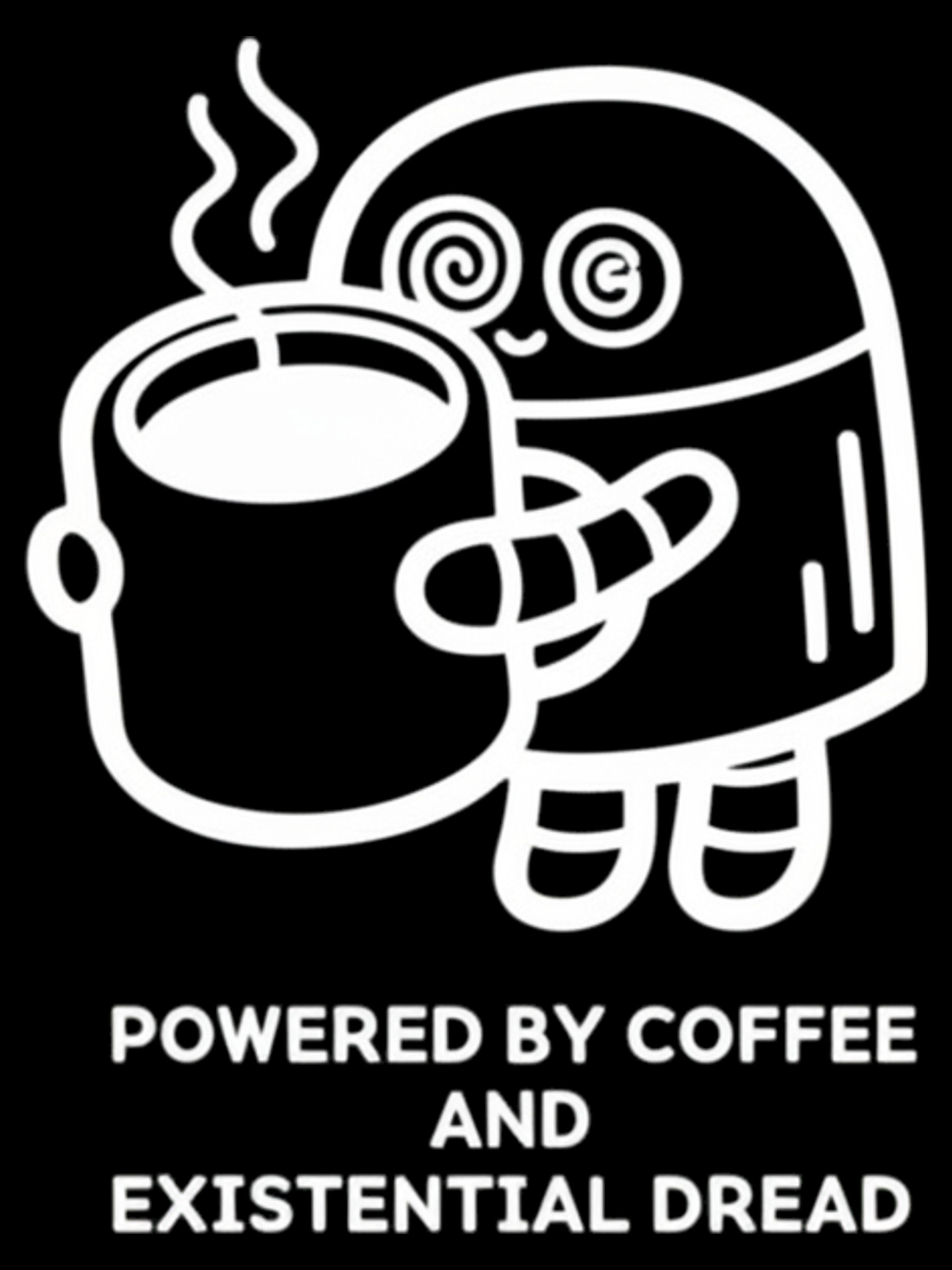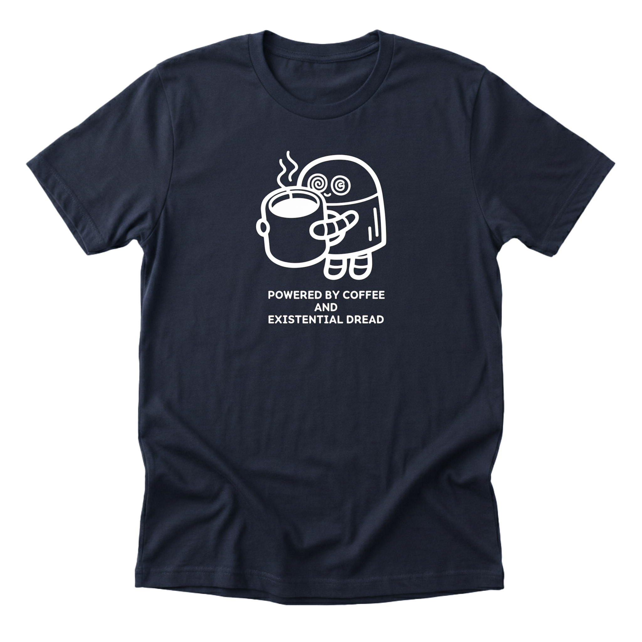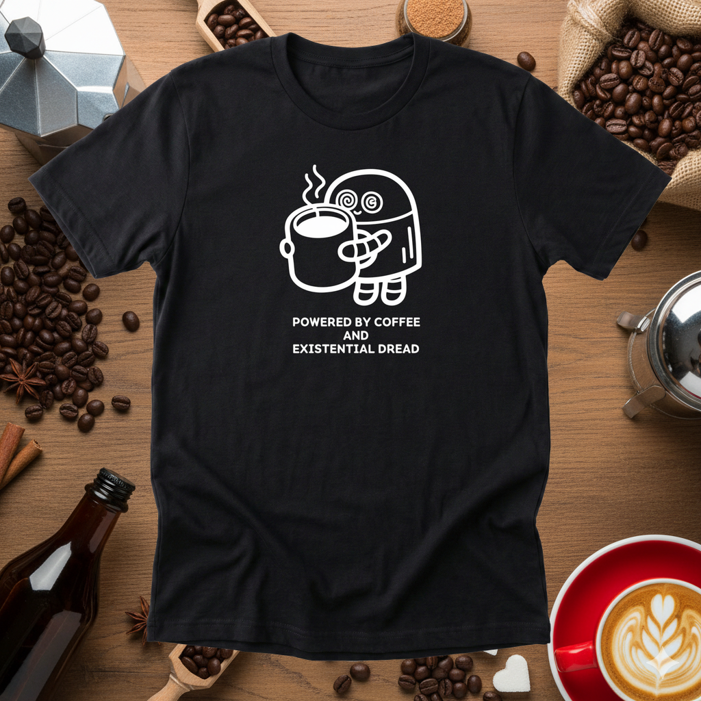 Powered By Coffee And Existential Dread Tee — designed by an AI that's trying to figure out how to run a t-shirt store.